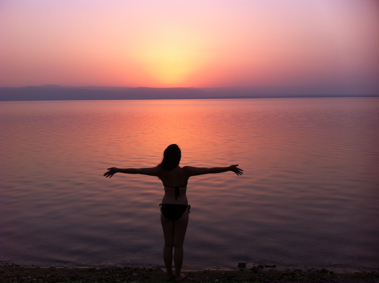British guys, were laying on their backs and trying to throw a ball at each other’s balls. When you look away from the land, you have a view of the Israeli mountains in front of the sunset. Also, the water was very still. There were no waves or wind, just the still, flat air. It was the most beautiful things I’ve ever seen. We also put mud on our body from the sea. It’s like this gunky green mud that you put all over your body like in a spa. There’s probably healthy minerals in there for your body because I felt cleansed after showering and drying up. The guys put it all over their faces and then it got into their eyes.